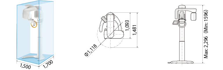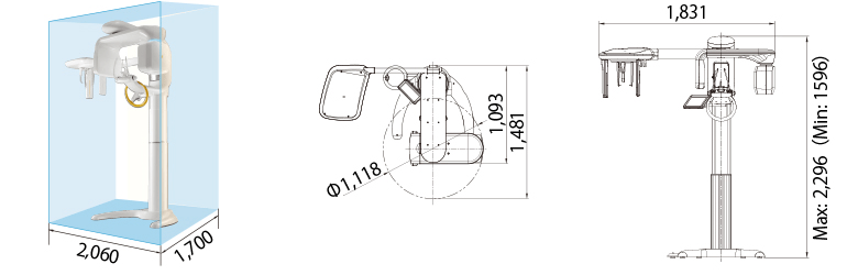 Pano + CT + Ceph: 177.5kgCBCT Panoamic Cephalometric(Oneshot type) センサータイプ TFT(a-si)detector TFT(a-si)detector CbTe detector F.O.V 10×10cm, 10×5cm - 20×22.5cm, 22×22.5cm, 26×22.5cm Voxelサイズ(CT) 100〜300μm - - 撮影時間 14sec Max. 14sec Min. 4.0sec 寸法図